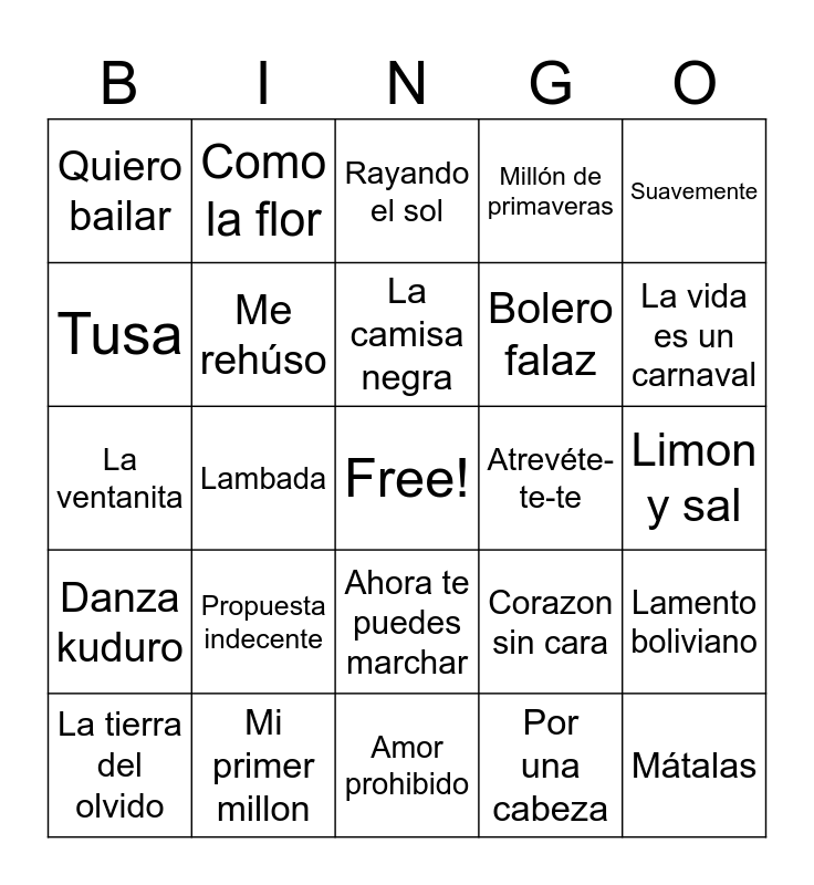 This bingo card has a free space and 34 words: Pepas, Por una cabeza, Mi gente, 15 años, Danza kuduro, Me rehúso, Suavemente, La tierra del olvido, Como la flor, La billirubina, La camisa negra, Rayando el sol, Ven bailalo, La dueña del swing, Atrevéte-te-te, La vida es un carnaval, Mi primer millon, La ventanita, Propuesta indecente, Corazon sin cara, Ahora te puedes marchar, De musica ligera, Quiero bailar, Limon y sal, Amor prohibido, Mátalas, Millón de primaveras, Sálvame, Bolero falaz, Tusa, Smooth, Lambada, Lamento boliviano and Afuera.