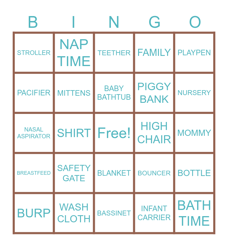 This bingo card has a free space and 45 words: TOYS, BATH TIME, WARMER, BURP, DIAPER BAG, INFANT CARRIER, TEETHER, CAR SEAT, PLAYPEN, WASH CLOTH, FAMILY, HIGH CHAIR, BLANKET, SAFETY GATE, DUE DATE, BASSINET, GRANDMA, NASAL ASPIRATOR, NEWBORN, NURSERY, NAP TIME, CHANGING PAD, BABY MONITOR, STROLLER, PACK OF BIBS, MOMMY, DADDY, GRANDPA, BOUNCER, BREASTFEED, MILK, BOTTLE, CRIB, ROCKING CHAIR, SHOES, SHIRT, BIB, BABY SOCKS, BABY LOTION, BABY BATHTUB, PACIFIER, PIGGY BANK, NIGHT LIGHT, MITTENS and BABY BOOK.