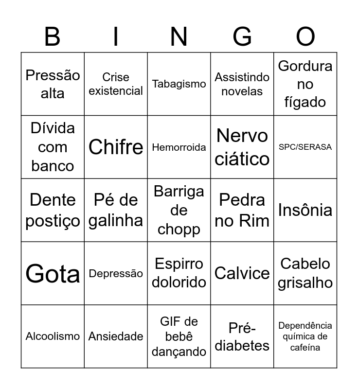This bingo card has a free space and 24 words: Depressão, Ansiedade, Hemorroida, Alcoolismo, Gordura no fígado, Pressão alta, Dívida com banco, Crise existencial, Pedra no Rim, Espirro dolorido, Nervo ciático, Dente postiço, Calvice, Cabelo grisalho, Chifre, Pré-diabetes, Insônia, Tabagismo, SPC/SERASA, Pé de galinha, Dependência química de cafeína, Gota, Assistindo novelas and GIF de bebê dançando.
