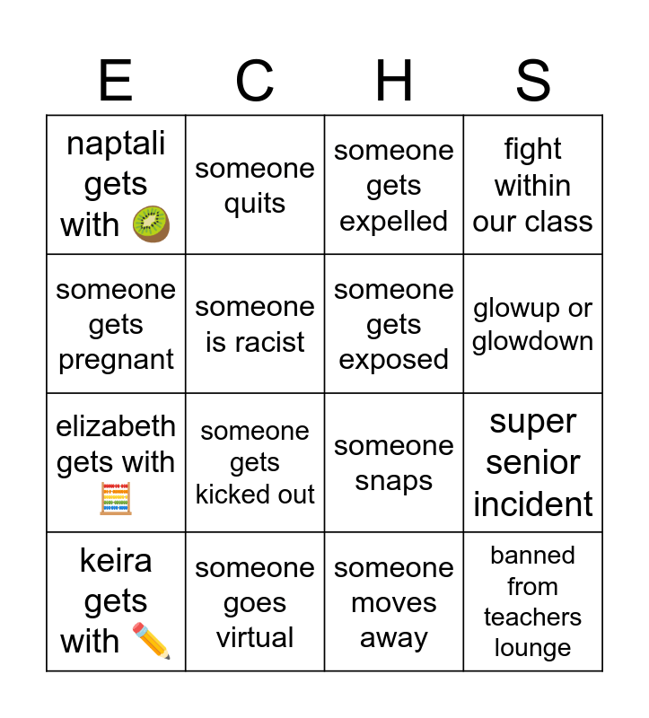 This bingo card has 16 words: someone goes virtual, super senior incident, someone gets expelled, naptali gets with 🥝, elizabeth gets with 🧮, someone quits, someone snaps, someone moves away, someone gets pregnant, someone is racist, keira gets with ✏️, fight within our class, someone gets kicked out, glowup or glowdown, someone gets exposed and banned from teachers lounge.