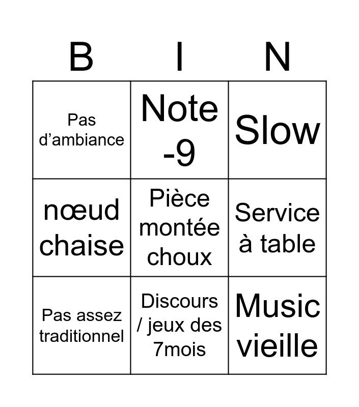 This bingo card has a free space and 8 words: Service à table, Slow, Note -9, Pas assez traditionnel, Pas d’ambiance, Music vieille, nœud chaise and Discours / jeux des 7mois.