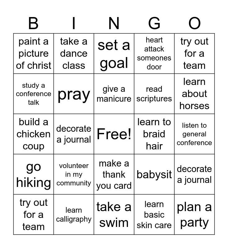 This bingo card has a free space and 29 words: try out for a team, cook a meal, decorate a journal, help with chores, paint a picture of christ, set a goal, pray, volunteer in my community, learn to braid hair, learn calligraphy, listen to general conference, plan a party, take a swim, learn basic skin care, learn about horses, write a letter to a missionary, make a thank you card, go hiking, try out for a team, build a chicken coup, babysit, learn to sew, read scriptures, study a conference talk, heart attack someones door, take a dance class, decorate a journal, give a manicure and make a goal board.