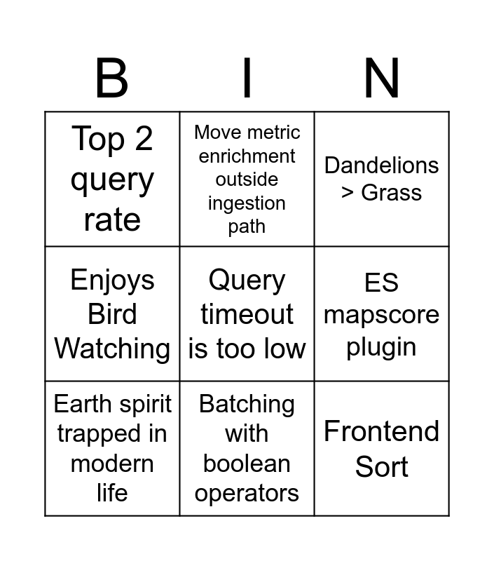 This bingo card has a free space and 24 words: What is orchestrator-writer, Org2 lag in us1, Batching with boolean operators, degraded mode triggered, Frontend Sort, Top 2 query rate, ES mapscore plugin, Move metric enrichment outside ingestion path, Buys Make-Up at DollarTree, A girl on main, a Man by birth, Only likes Mario Kart for racing games, Never outgrew Random phase, Witch Doctor, Spirit animal is grumpy old hermit, Earth spirit trapped in modern life, Skyrim is love, Marowind is life, Loves PC Games, Plays Console, Dandelions > Grass, Sweet Tea Addict, Destroy Big Pharma, Customer Service Associate, Living Garbage Disposal, Enjoys Bird Watching and Fluent in Motherese.