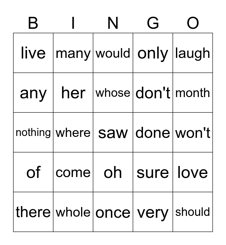This bingo card has a free space and 26 words: oh, very, whose, whole, laugh, live, any, many, won't, sure, don't, nothing, love, there, where, because, only, of, would, should, month, once, done, come, her and almost.