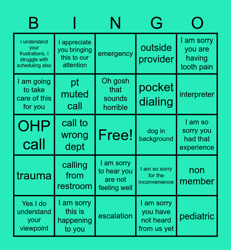 This bingo card has a free space and 26 words: I am sorry to hear you are not feeling well, I am sorry you have not heard from us yet, Oh gosh that sounds horrible, I am sorry this is happening to you, I am sorry you are having tooth pain, I understand your frustrations, I struggle with scheduling also, I am going to take care of this for you, I appreciate you bringing this to our attention, I am so sorry you had that experience, I am so sorry for the inconvenience, pocket dialing, OHP call, non member, Yes I do understand your viewpoint, call to wrong dept, solicitor call, outside provider, trauma, emergency, pediatric, interpreter, escalation, dog in background, calling from restroom, pt muted call and call dropped.