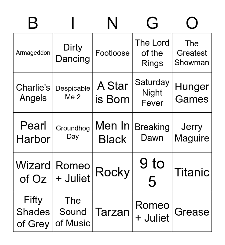 This bingo card has 25 words: Romeo + Juliet, Tarzan, A Star is Born, Fifty Shades of Grey, The Greatest Showman, Armageddon, Charlie's Angels, Dirty Dancing, Breaking Dawn, Rocky, Saturday Night Fever, Pearl Harbor, 9 to 5, Titanic, Despicable Me 2, Grease, Jerry Maguire, Footloose, Hunger Games, Groundhog Day, Men In Black, The Sound of Music, Wizard of Oz, The Lord of the Rings and Romeo + Juliet.
