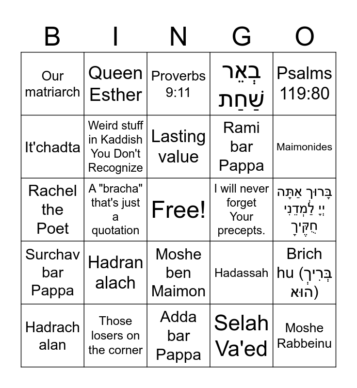 This bingo card has a free space and 42 words: The Race to Nowhere, Lasting value, Amen, Hadran alach, Selah Va'ed, Brich hu (בְּרִיךְ הוּא), Moshe Rabbeinu, Rachel Imenu, Proverbs 9:11, Moshe ben Maimon, בָּרוּךְ אַתָּה יְיָ לַמֽדֵנִי חֻקֶּיךָ, Maimonides, A "bracha" that's just a quotation, Psalms 119:80, עָתִיד לְאִתְחַדְתָּא, Hadassah, מוֹדִים אֲנַחְנוּ לְּפָנֶיךָ, Rachel the Poet, Amoraim, Queen Esther, It'chadta, Amen Amen Amen, יְהֵא שְׁמֵהּ רַבָּא מְבָרַךְ לְעָלַם וּלְעָלְמֵי עָלְמַיָּא, Our matriarch, Chanina bar Pappa, יְיָ יְבָרֵךְ אֶת עַמּוֹ בַשָּׁלוֹם, Rami bar Pappa, Psalms 119:98, מוֹדִים אֲנַחְנוּ לְּפָנֶיךָ, Proverbs 6:22, The opportunity to learn, Surchav bar Pappa, Weird stuff in Kaddish You Don't Recognize, Adda bar Pappa, אֹרֶךְ יָמִים בִּימִינָהּ בִּשְׂמֹאולָהּ עֹשֶׁר וְכָבוֹד, Hadrach alan, Those losers on the corner, I will never forget Your precepts., Amen, Daru bar Pappa, בְאֵר שַׁחַת and Tanna'im.
