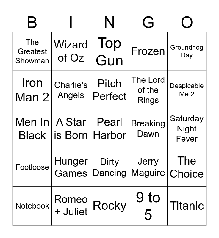 This bingo card has 30 words: Romeo + Juliet, Tarzan, A Star is Born, Fifty Shades of Grey, The Greatest Showman, Top Gun, Charlie's Angels, Dirty Dancing, Breaking Dawn, Rocky, Saturday Night Fever, Pearl Harbor, 9 to 5, Titanic, Despicable Me 2, Grease, Jerry Maguire, Footloose, Hunger Games, Groundhog Day, Men In Black, The Sound of Music, Wizard of Oz, The Lord of the Rings, Iron Man 2, Frozen, The Choice, Notebook, Pitch Perfect and American Sniper.