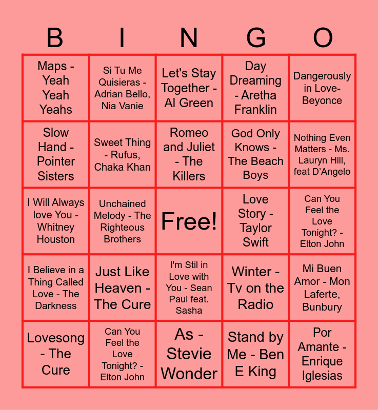 This bingo card has a free space and 24 words: Just Like Heaven - The Cure, Can You Feel the Love Tonight? - Elton John, Romeo and Juliet - The Killers, Lovesong - The Cure, Dangerously in Love- Beyonce, Maps - Yeah Yeah Yeahs, Slow Hand - Pointer Sisters, Si Tu Me Quisieras - Adrian Bello, Nia Vanie, Love Story - Taylor Swift, I'm Stil in Love with You - Sean Paul feat. Sasha, God Only Knows - The Beach Boys, I Will Always love You - Whitney Houston, Winter - Tv on the Radio, Mi Buen Amor - Mon Laferte, Bunbury, Sweet Thing - Rufus, Chaka Khan, Stand by Me - Ben E King, Can You Feel the Love Tonight? - Elton John, Let's Stay Together - Al Green, Nothing Even Matters - Ms. Lauryn Hill, feat D’Angelo, Unchained Melody - The Righteous Brothers, Por Amante - Enrique Iglesias, I Believe in a Thing Called Love - The Darkness, Day Dreaming - Aretha Franklin and As - Stevie Wonder.