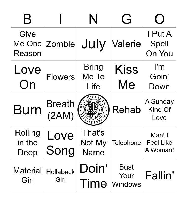 This bingo card has a free space and 53 words: Love On The Brain, Fallin', Killing Me Softly With His Song, Bust Your Windows, Love Song, The Climb, Zombie, Glory Box, Love On, Jolene, Flowers, Before He Cheats, Man! I Feel Like A Woman!, Telephone, Heaven Is A Place On Earth, Material Girl, Bring Me To Life, Rehab, Dog Days Are Over, I Put A Spell On You, Breath (2AM), Dremas, Kiss Me, Give Me One Reason, Waterfalls, Hollaback Girl, Wannabe, Toxic, The Boy Is Mine, I'm Goin' Down, Unwritten, Sk8er Boi, Behind These Hazel Eyes, A Thousand Miles, Someone Like You, If I Were a Boy, Valerie, Doin' Time, July, Complicated, TiK ToK, I Will Always Love You, A Sunday Kind Of Love, Girlfriend, Price Tag, That's Not My Name, Bulletproof, Replay, Burn, Rolling in the Deep, Gypsys, Tramps & Thieves, Physical and Woman.