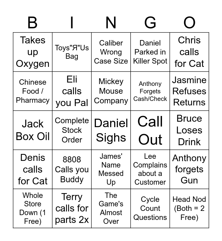 This bingo card has 40 words: Free!, Jack Box Oil, Chris Auto Tune Up, Eli calls you Pal, Terry calls for parts 2x, James' Name Messed Up, Mickey Mouse Company, Corporate Calls, Chris calls for Cat, Denis calls for Cat, Complete Stock Order, Daniel Parked in Killer Spot, Daniel Sighs, Bruce Loses Drink, Call Out, 8808 Calls you Buddy, Duke PMOR, Takes up Oxygen, HUh (5+ = Free Space), Caliber Wrong Case Size, Anthony forgets Gun, Cycle Count Questions, Anthony Forgets Cash/Check, Chinese Food / Pharmacy, Inappropriate Gus Joke x3, Ramsey Transfer Call, BMW Paranoia, Big Things in 2024, Head Nod (Both = 2 Free), Computer Crash, Call IT/Service Now, Whole Store Down (1 Free), Gimpy Leaves a Project Unattended, Lee Complains about a Customer, Jasmine Refuses Returns, The Game's Almost Over, 10K < Day, 4k > Day, Toys"Я"Us Bag and Ben Called Day Off/Lunch.