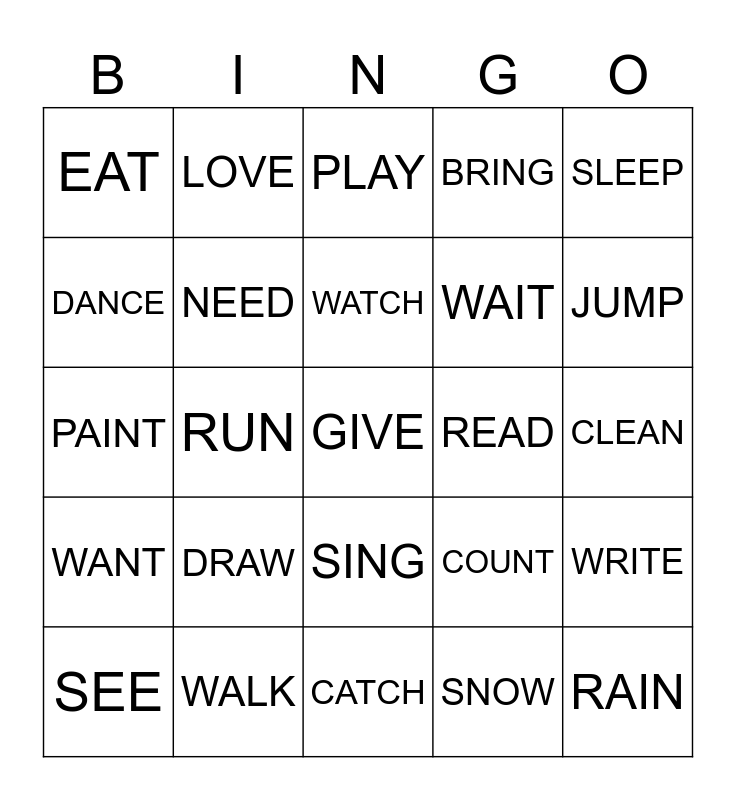 This bingo card has a free space and 24 words: DRAW, WALK, WATCH, SEE, SLEEP, EAT, DANCE, LOVE, READ, SING, WAIT, PAINT, COUNT, WRITE, NEED, SNOW, CLEAN, PLAY, JUMP, RUN, RAIN, WANT, BRING and CATCH.