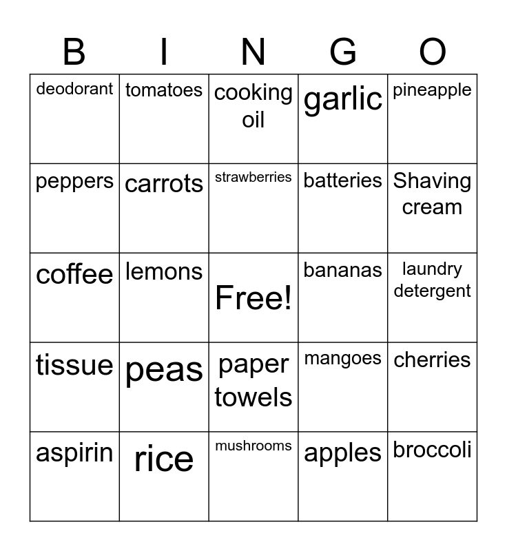 This bingo card has a free space and 46 words: celery, broccoli, onion, mushrooms, peas, potatoes, tomatoes, lettuce, peppers, cucumbers, carrots, garlic, cherries, mangoes, oranges, pears, strawberries, bananas, peaches, pineapple, lemons, apples, deodorant, batteries, shampoo, Shaving cream, aspirin, razors, paper towels, tissue, lightbulbs, soap, toothpaste, toilet paper, flour, rice, laundry detergent, beans, tea, pasta, sugar, cooking oil, coffee, chips, diapers and cough syrup.