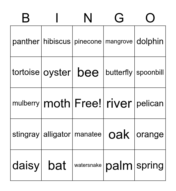 This bingo card has a free space and 24 words: alligator, bat, bee, daisy, dolphin, panther, tortoise, hibiscus, river, manatee, butterfly, mulberry, oak, orange, oyster, palm, pelican, pinecone, spoonbill, moth, spring, stingray, mangrove and watersnake.
