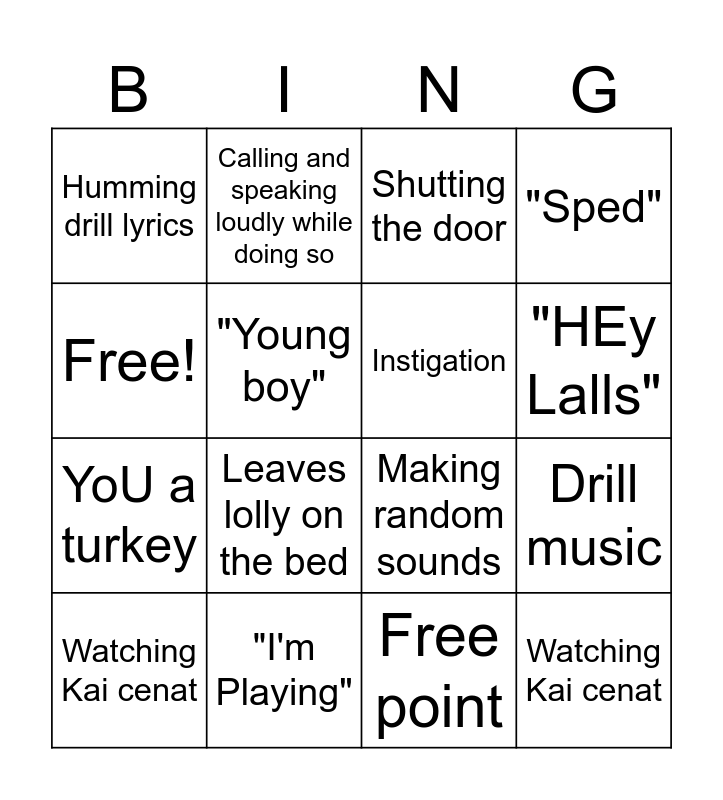This bingo card has 16 words: "I'm Playing", Drill music, Shutting the door, Humming drill lyrics, YoU a turkey, Calling and speaking loudly while doing so, Making random sounds, Free point, Free!, "Young boy", Watching Kai cenat, "Sped", Leaves lolly on the bed, "HEy Lalls", Instigation and Watching Kai cenat.