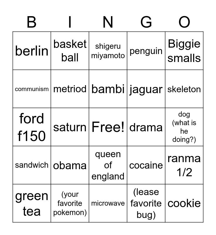 This bingo card has a free space and 24 words: obama, (your favorite pokemon), bambi, green tea, Biggie smalls, berlin, communism, basket ball, drama, queen of england, jaguar, ford f150, cocaine, ranma 1/2, metriod, (lease favorite bug), dog (what is he doing?), shigeru miyamoto, skeleton, saturn, cookie, sandwich, penguin and microwave.