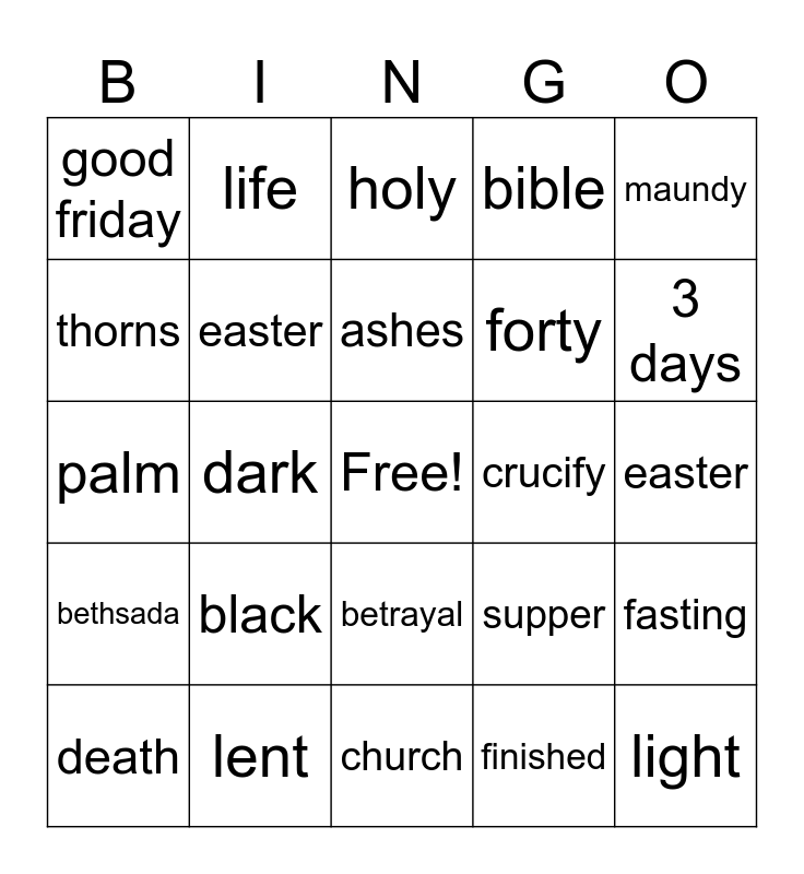 This bingo card has a free space and 24 words: black, lent, ashes, death, maundy, good friday, thorns, life, crucify, betrayal, forty, palm, supper, fasting, easter, finished, easter, holy, 3 days, dark, light, bethsada, bible and church.