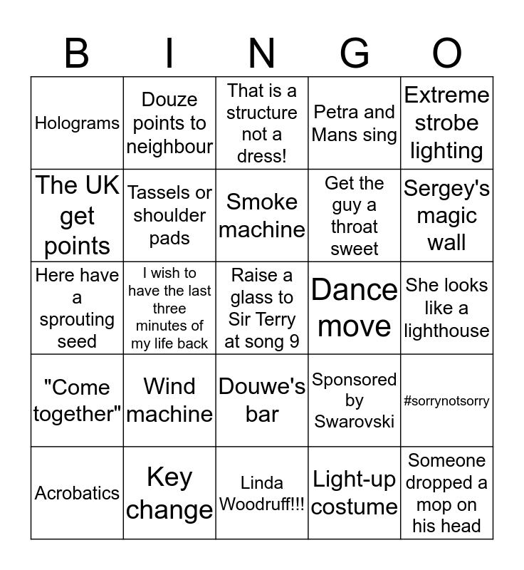 This bingo card has a free space and 24 words: Wind machine, Key change, Smoke machine, Acrobatics, Extreme strobe lighting, Holograms, The UK get points, Douze points to neighbour, Dance move, Douwe's bar, Get the guy a throat sweet, Here have a sprouting seed, Sponsored by Swarovski, #sorrynotsorry, Tassels or shoulder pads, Light-up costume, She looks like a lighthouse, That is a structure not a dress!, Sergey's magic wall, I wish to have the last three minutes of my life back, Someone dropped a mop on his head, "Come together", Petra and Mans sing and Linda Woodruff!!!.