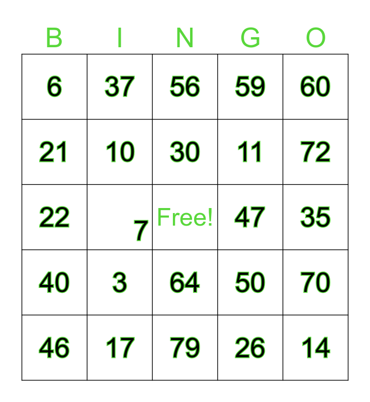 This bingo card has a free space and 24 words: 3, 17, 30, 46, 60, 6, 21, 37, 47, 64, 11, 22, 50, 70, 10, 26, 35, 56, 72, 7, 14, 40, 59 and 79.