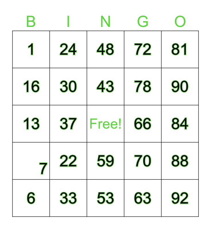 This bingo card has a free space and 24 words: 6, 22, 43, 63, 81, 1, 24, 48, 66, 84, 13, 30, 70, 88, 16, 33, 53, 72, 90, 7, 37, 59, 78 and 92.