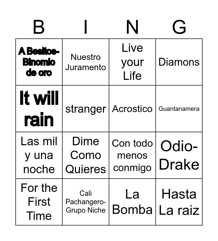 This bingo card has 16 words: Cali Pachangero- Grupo Niche, Odio- Drake, Live your Life, A Besitos- Binomio de oro, Las mil y una noche, Nuestro Juramento, Con todo menos conmigo, La Bomba, It will rain, stranger, For the First Time, Diamons, Dime Como Quieres, Guantanamera, Acrostico and Hasta La raiz.