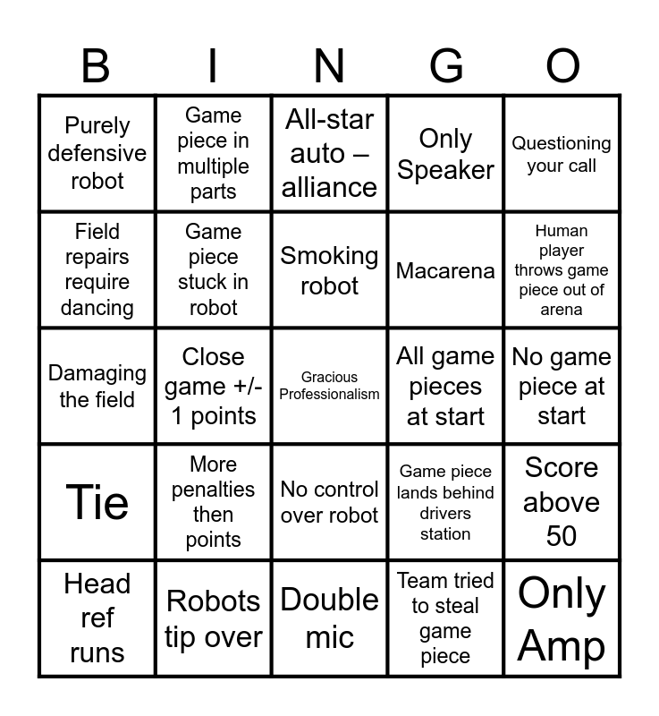 This bingo card has a free space and 40 words: Bumpers fall off, Damaging the field, Robot in auto goes across the field, Game piece stuck in robot, Robots tip over, No control over robot, Smoking robot, Losing non disableable part, Questioning your call, Tie, Close game +/- 1 points, Only Speaker, Only Amp, No game piece at start, All game pieces at start, More penalties then points, A pass, Purely defensive robot, All-star auto - robot, All-star auto – alliance, Score above 50, Team tried to steal game piece, Macarena, Field repairs require dancing, Behind/ahead by 30 minutes, Left item in robot, Non robot part found on field, Two Robot Alliance (not practice), Replay, Parts required from pit, Robot falls out of starting configuration, Head ref runs, 3 or more colored hats, Game piece lands behind drivers station, Human player throws game piece out of arena, Double mic, Triple climb, 4 RP, Game piece in multiple parts and Parking boot.