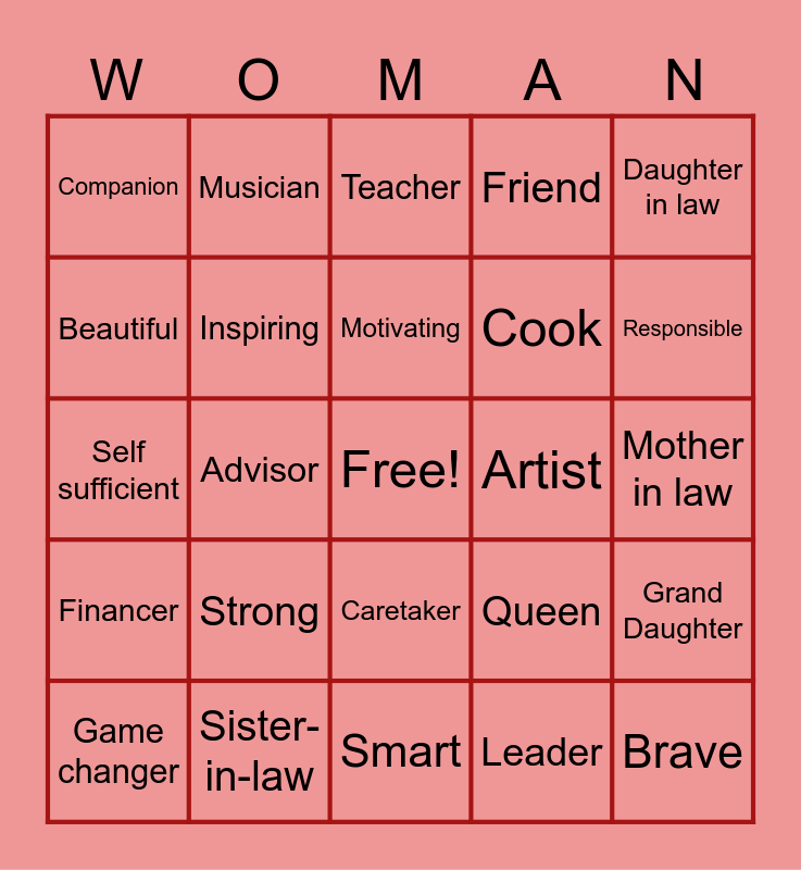 This bingo card has a free space and 69 words: Mother, Mother in law, Sister, Girl, Sister-in-law, Cousin, Friend, Daughter, Daughter in law, Grand Mother, Grand Daughter, Aunty, Companion, Teacher, Doctor, Advisor, Caretaker, Cook, Helper, Financer, Artist, Queen, Responsible, Enthusiastic, Planner, Organiser, Manager, Supporter, Leader, Homemaker, Musician, Dancer, Guide, Counselor, Powerful, Loving, Caring, Emotional, Beautiful, Spiritual, Strong, Brave, Challenger, Entertainer, Decision maker, Game changer, Innovative, Empathetic, Confident, Inspiring, Motivating, Ambitious, Compassionate, Smart, Kind, Trustworthy, Generous, Patient, Creative, Self sufficient, Gentle, Adventurous, Determined, Joyful, Selfless, Stylish, Dynamic, Diplomatic and Romantic.