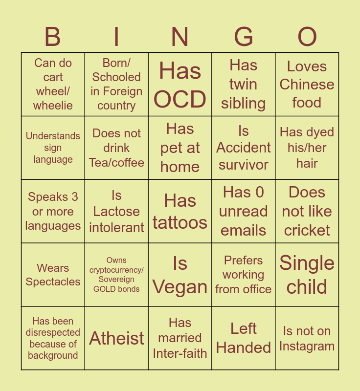 This bingo card has a free space and 28 words: Single child, Has Scars, Is Accident survivor, Left Handed, Understands sign language, Has OCD, Born/ Schooled in Foreign country, Wears Spectacles, Has 0 unread emails, Has been disrespected because of background, Speaks 3 or more languages, Has twin sibling, Atheist, Has married Inter-faith, Has dyed his/her hair, Has lived on a farm, Owns cryptocurrency/ Sovereign GOLD bonds, Does not drink Tea/coffee, Has pet at home, Is Vegan, Can do cart wheel/ wheelie, Does not like Pizza, Is not on Instagram, Is Lactose intolerant, Does not like cricket, Prefers working from office, Loves Chinese food and Have watched sports in staduim.