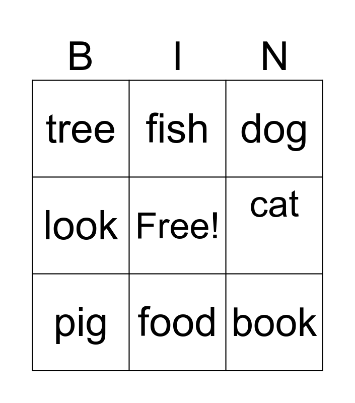 This bingo card has a free space and 8 words: cat, dog, fish, pig, tree, book, look and food.