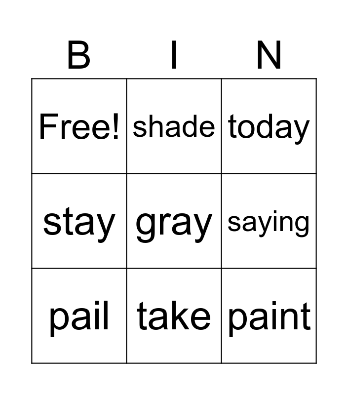 This bingo card has 30 words: raining, pay, braid, clay, Free!, today, pail, aid, sail, cake, raisin, spray, nail, name, wait, wave, trade, grain, play, gray, tray, waist, shade, paint, saying, stay, chain, make, take and faint.