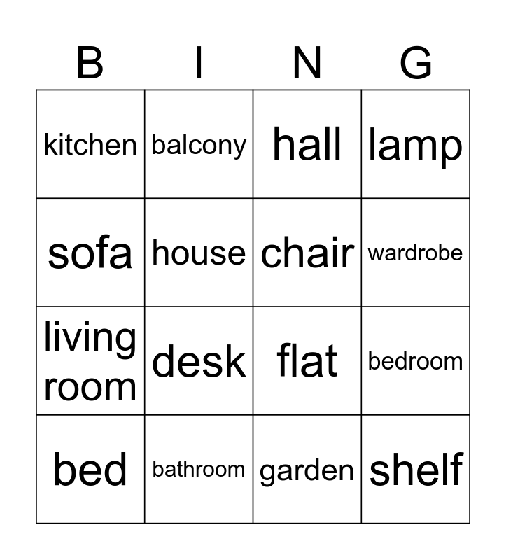 This bingo card has 16 words: bathroom, bedroom, hall, kitchen, living room, balcony, flat, garden, sofa, house, bed, lamp, desk, wardrobe, chair and shelf.