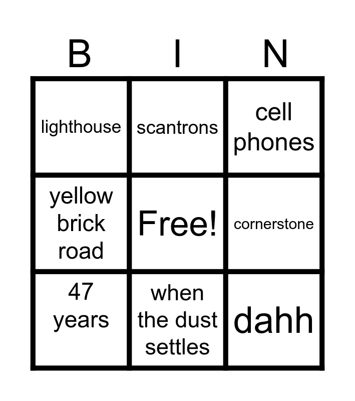 This bingo card has a free space and 9 words: 47 years, cell phones, scantrons, yellow brick road, lighthouse, cornerstone, dahh, engine and when the dust settles.