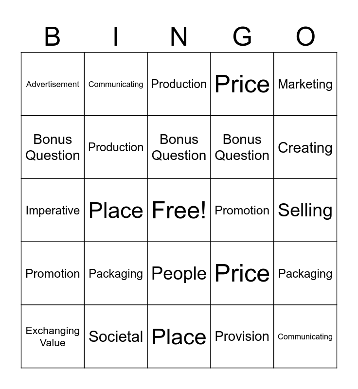 This bingo card has a free space and 43 words: Creating, Communicating, Delivering, Exchanging Value, Advertisement, Provision, Production, Selling, Marketing, Societal, Price, Promotion, People, Packaging, Process, Place, Propaganda, Imperative, Sustain, Creating, Communicating, Delivering, Exchanging Value, Advertisement, Provision, Selling, Marketing, Societal, Price, Promotion, People, Packaging, Process, Place, Propaganda, Imperative, Sustain, Bonus Question, Bonus Question, Bonus Question, Bonus Question, Production and Bonus Question.