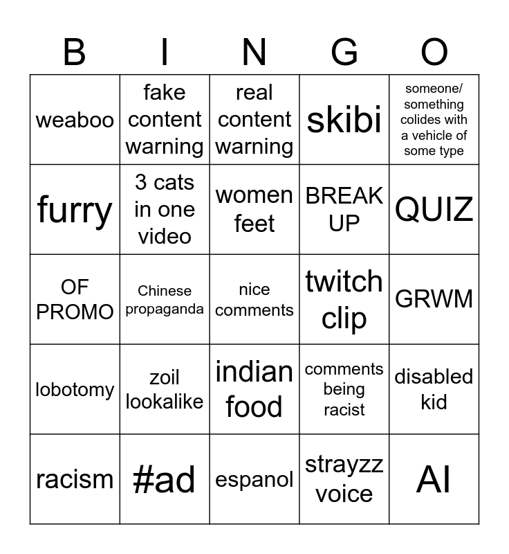 This bingo card has a free space and 24 words: zoil lookalike, #ad, women feet, racism, someone/ something colides with a vehicle of some type, weaboo, furry, fake content warning, twitch clip, indian food, BREAK UP, OF PROMO, comments being racist, disabled kid, 3 cats in one video, strayzz voice, GRWM, real content warning, QUIZ, Chinese propaganda, AI, lobotomy, skibi and espanol.