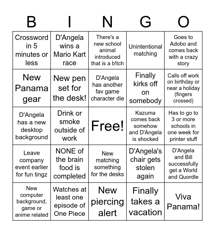This bingo card has a free space and 24 words: NONE of the brain food is completed, Watches at least one episode of One Piece, D'Angela has another fav game character die, New computer background, game or anime related, Goes to Adobo and comes back with a crazy story, Crossword in 5 minutes or less, New Panama gear, D'Angela wins a Mario Kart race, Kazuma comes back somehow and D'Angela is shocked, New matching something for the desks, Finally kirks off on somebody, D'Angela has a new desktop background, D'Angela's chair gets stolen again, D'Angela and Bill successfully get a World and Quordle, New pen set for the desk!, Finally takes a vacation, Has to go to 3 or more schools in one week for printer stuff, There's a new school animal introduced that is a b!tch, Calls off work on birthday or near a holiday (fingers crossed), Drink or smoke outside of work, Viva Panama!, Leave company event earlier for fun tingz, Unintentional matching and New piercing alert.