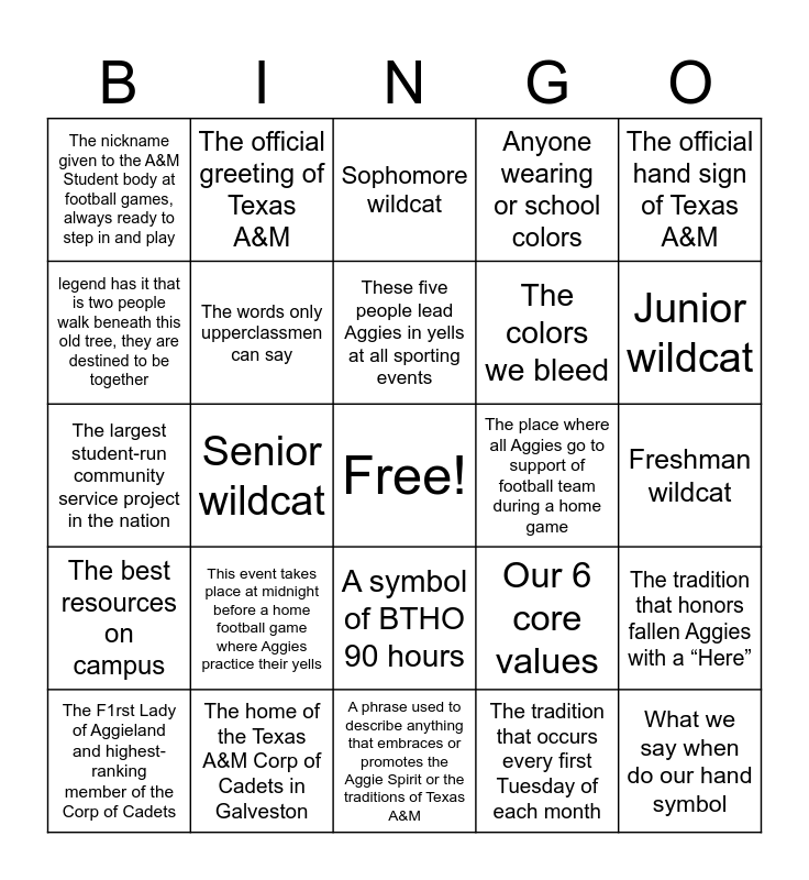 This bingo card has a free space and 24 words: This event takes place at midnight before a home football game where Aggies practice their yells, The home of the Texas A&M Corp of Cadets in Galveston, These five people lead Aggies in yells at all sporting events, The F1rst Lady of Aggieland and highest-ranking member of the Corp of Cadets, The official hand sign of Texas A&M, The nickname given to the A&M Student body at football games, always ready to step in and play, legend has it that is two people walk beneath this old tree, they are destined to be together, The official greeting of Texas A&M, The place where all Aggies go to support of football team during a home game, A symbol of BTHO 90 hours, The colors we bleed, The largest student-run community service project in the nation, Our 6 core values, The tradition that honors fallen Aggies with a “Here”, The words only upperclassmen can say, The tradition that occurs every first Tuesday of each month, Freshman wildcat, Sophomore wildcat, Junior wildcat, Senior wildcat, What we say when do our hand symbol, The best resources on campus, Anyone wearing or school colors and A phrase used to describe anything that embraces or promotes the Aggie Spirit or the traditions of Texas A&M.