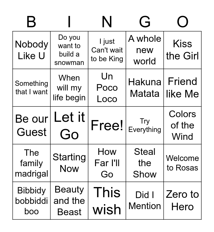 This bingo card has a free space and 33 words: Your're Welcome, Surface Pressure, Let it Go, We don't talk about Bruno, The family madrigal, When will my life begin, Kiss the Girl, Bibbidy bobbiddi boo, Do you want to build a snowman, Under the Sea, Un Poco Loco, I just Can't wait to be King, Reflection, All I want, Try Everything, Friend like Me, Beauty and the Beast, Be our Guest, Starting Now, Steal the Show, How Far I'll Go, Life is a Highway, Nobody Like U, Colors of the Wind, This wish, Zero to Hero, A whole new world, Hakuna Matata, Something that I want, Welcome to Rosas, A Girl Worth Fighting For, Did I Mention and Whats my Name.