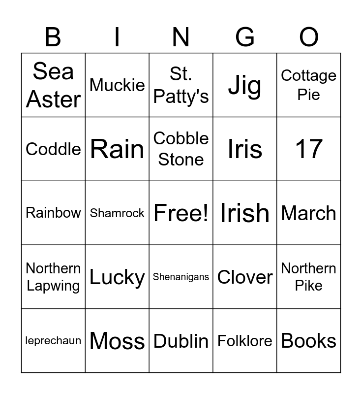 This bingo card has a free space and 29 words: leprechaun, Gold, Shamrock, Pinch, Sea Aster, St. Patty's, Rain, Lucky, Irish, Moss, March, Books, Dublin, Folklore, 17, Tulips, Shenanigans, Northern Lapwing, Cottage Pie, Rainbow, Clover, Malarky, Iris, Coddle, Jig, Muckie, Northern Pike, Cobble Stone and Green.