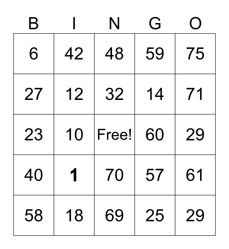 This bingo card has a free space and 24 words: 1, 18, 32, 58, 75, 6, 27, 42, 60, 70, 14, 23, 57, 61, 12, 25, 29, 48, 71, 10, 29, 40, 59 and 69.