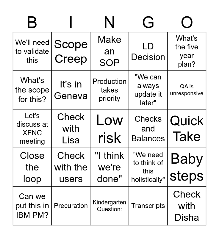 This bingo card has 25 words: Check with the users, Kindergarten Question:, Production takes priority, Can we put this in IBM PM?, What's the five year plan?, We'll need to validate this, What's the scope for this?, Scope Creep, Checks and Balances, "I think we're done", "We can always update it later", Let's discuss at XFNC meeting, "We need to think of this holistically", Baby steps, It's in Geneva, Check with Disha, Quick Take, Make an SOP, QA is unresponsive, Check with Lisa, Low risk, Precuration, Close the loop, LD Decision and Transcripts.