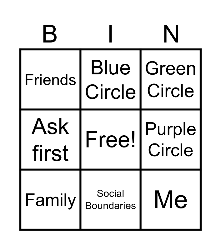 This bingo card has a free space and 8 words: Purple Circle, Green Circle, Blue Circle, Family, Friends, Me, Ask first and Social Boundaries.