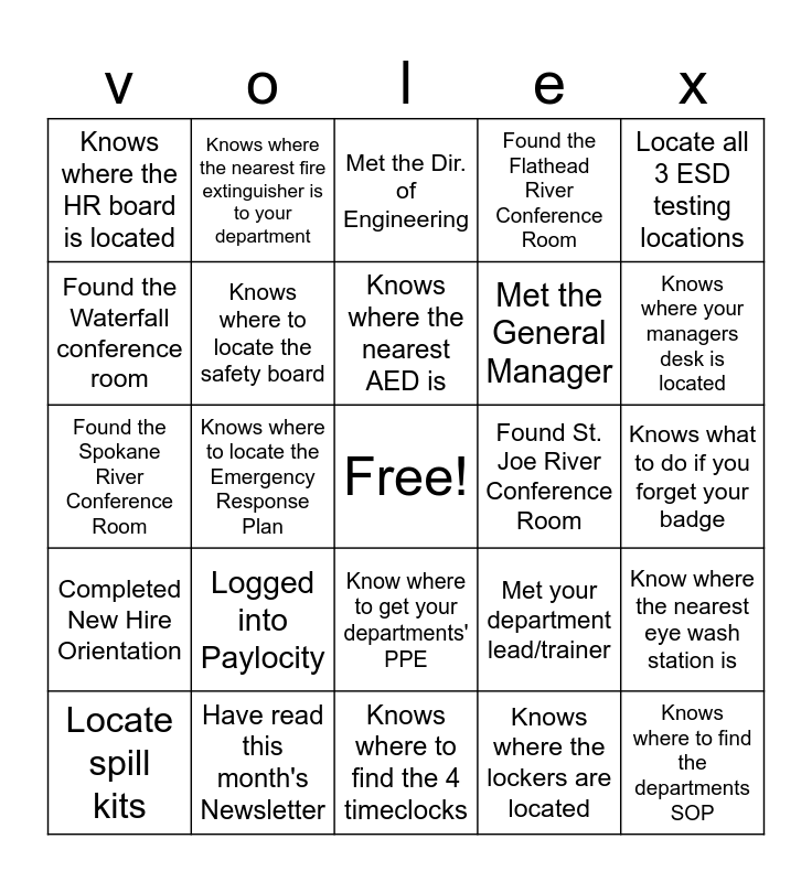 This bingo card has a free space and 29 words: Locate spill kits, Met the HR Manager, Knows where to locate the Emergency Response Plan, You've singed up for Commutesmart nw.org, Knows where the HR board is located, Met the Dir. of Engineering, Knows where to locate the safety board, Logged into Paylocity, Found St. Joe River Conference Room, Have read this month's Newsletter, Knows what to do if you forget your badge, Knows where to find the departments SOP, Knows where to find the 4 timeclocks, Knows where the lockers are located, Knows where your managers desk is located, Knows the departments break and lunch time, Know where to get your departments' PPE, Completed New Hire Orientation, Locate all 3 ESD testing locations, Found the Spokane River Conference Room, Met your department lead/trainer, You know the evacuation plan, Met the General Manager, Found the Waterfall conference room, Found the Flathead River Conference Room, Knows where the nearest fire extinguisher is to your department, Know where the nearest eye wash station is, Knows where the nearest AED is and Knows where the nearest first aid kit is located.
