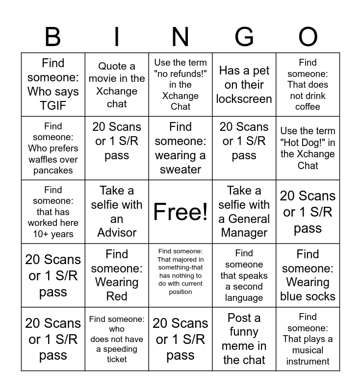 This bingo card has a free space and 24 words: 20 Scans or 1 S/R pass, Find someone: Wearing Red, Find someone: wearing a sweater, Post a funny meme in the chat, Find someone: That does not drink coffee, Find someone: Who says TGIF, Quote a movie in the Xchange chat, Use the term "no refunds!" in the Xchange Chat, Take a selfie with a General Manager, 20 Scans or 1 S/R pass, Find someone: that has worked here 10+ years, 20 Scans or 1 S/R pass, Find someone that speaks a second language, Find someone: Wearing blue socks, Find someone: Who prefers waffles over pancakes, Find someone: who does not have a speeding ticket, 20 Scans or 1 S/R pass, Has a pet on their lockscreen, Use the term "Hot Dog!" in the Xchange Chat, 20 Scans or 1 S/R pass, Take a selfie with an Advisor, Find someone: That majored in something-that has nothing to do with current position, 20 Scans or 1 S/R pass and Find someone: That plays a musical instrument.