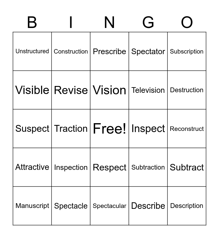 This bingo card has a free space and 44 words: Transcript, Description, Scribble, Manuscript, Scribe, Describe, Prescribe, Prescription, Subscription, Spectacle, Spectator, Inspect, Respect, Inspection, Perspective, Spectacular, Spectate, Suspect, Instruct, Destruction, Construction, Structure, Indestructible, Unstructured, Instruction, Reconstruct, Destruct, Tractor, Subtraction, Attractive, Attract, Subtract, Contract, Distract, Traction, Extract, Invisible, Visualize, Vision, Visible, Television, Provider, Revise and Visitor.