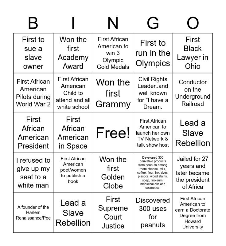 This bingo card has a free space and 24 words: First African American poet/women to publish a book, Lead a Slave Rebellion, Won the first Grammy, A founder of the Harlem Renaissance/Poe, First Black Lawyer in Ohio, First to sue a slave owner, First African American Pilots during World War 2, Won the first Academy Award, First African American to launch her own TV Network & talk show host, Won the first Golden Globe, Civil Rights Leader..and well known for "I have a Dream., First African American President, Developed 300 derivative products from peanuts among them cheese, milk, coffee, flour, ink, dyes, plastics, wood stains, soap, linoleum, medicinal oils and cosmetics., Jailed for 27 years and later became the president of Africa, First African American Child to attend and all white school, Discovered 300 uses for peanuts, Lead a Slave Rebellion, First African American to win 3 Olympic Gold Medals, Conductor on the Underground Railroad, First African American in Space, First African American to earn a Doctorate Degree from Howard University, I refused to give up my seat to a white man, First to run in the Olympics and First Supreme Court Justice.