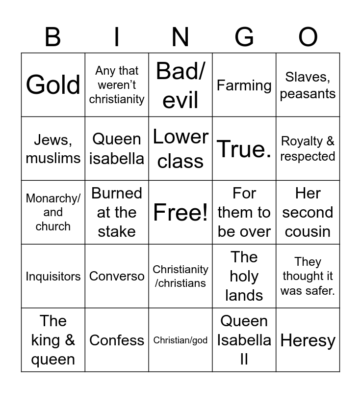 This bingo card has a free space and 24 words: Converso, Confess, Lower class, The king & queen, Slaves, peasants, Gold, Jews, muslims, Any that weren’t christianity, For them to be over, Christianity /christians, True., Monarchy/ and church, The holy lands, They thought it was safer., Queen isabella, Queen Isabella II, Her second cousin, Bad/ evil, Royalty & respected, Burned at the stake, Heresy, Inquisitors, Farming and Christian/god.