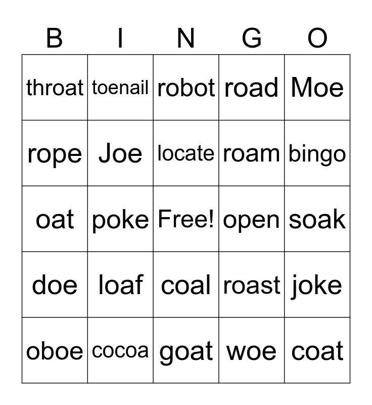 This bingo card has a free space and 34 words: toe, woe, hoe, foe, doe, Joe, Moe, oboe, toenail, tiptoe, locate, robot, banjo, hotel, open, bingo, cocoa, oat, loaf, roast, coal, boast, throat, soak, goat, coat, road, load, roam, rope, hope, poke, joke and drove.