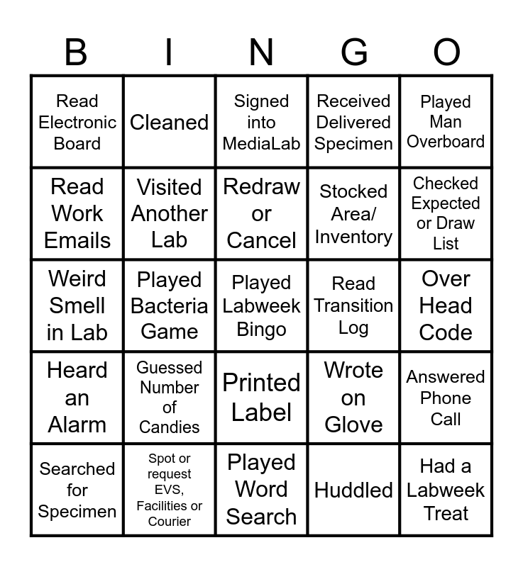 This bingo card has a free space and 24 words: Guessed Number of Candies, Spot or request EVS, Facilities or Courier, Redraw or Cancel, Searched for Specimen, Played Man Overboard, Read Electronic Board, Read Work Emails, Cleaned, Read Transition Log, Printed Label, Stocked Area/ Inventory, Weird Smell in Lab, Wrote on Glove, Answered Phone Call, Visited Another Lab, Huddled, Over Head Code, Signed into MediaLab, Checked Expected or Draw List, Played Bacteria Game, Had a Labweek Treat, Heard an Alarm, Received Delivered Specimen and Played Word Search.