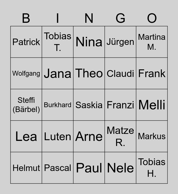 This bingo card has 55 words: Petra M., Helmut, Jette, Patrick, Paul, Gracy, Jana, Kersten, Claudi, Ute, Jürgen, Brigitte, Katrin, Chris, Martina D., André, Martina M., Burkhard, Christoph, Saskia, Franzi, Matthias, Matze R., Nina, Jessica, Theo, Nele, Anne, Melli, Markus, Lucy, Steffi B., Ronny, Helga, Wolfgang, Steffi (Bärbel), Sebastian, Lea, Tobias H., Caro, Tobias T., Celine, Annalena, Marie-Ann, Luten, Pascal, Axel, Steffi Bochardt, Karsten, Frank, Gabi, Elke, Thomas, Arne and Benni.