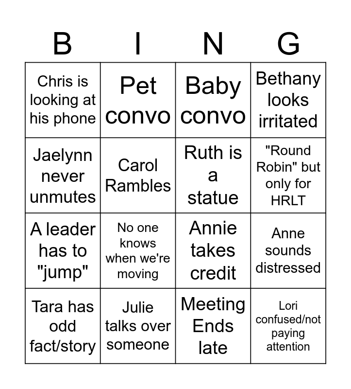 This bingo card has 16 words: Julie talks over someone, Anne sounds distressed, Baby convo, Chris is looking at his phone, A leader has to "jump", Pet convo, Annie takes credit, Meeting Ends late, Jaelynn never unmutes, Carol Rambles, Tara has odd fact/story, Bethany looks irritated, No one knows when we're moving, "Round Robin" but only for HRLT, Ruth is a statue and Lori confused/not paying attention.